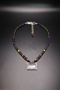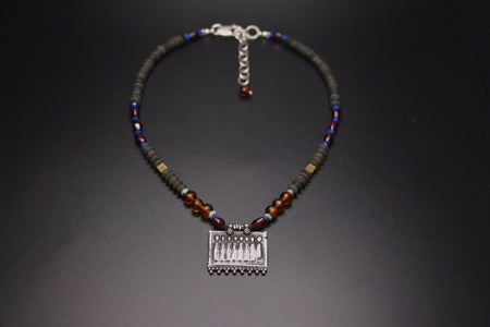 Strung with baltic amber, garnet, lapis, brass, black jade, and tiny turquoise beads. Hand knotted in places for strength and intention. Amber for warmth and vitality. Garnet for life force and devotion. Black jade for grounding and protection. Lapis for wisdom. Turquoise for clarity and open expression.